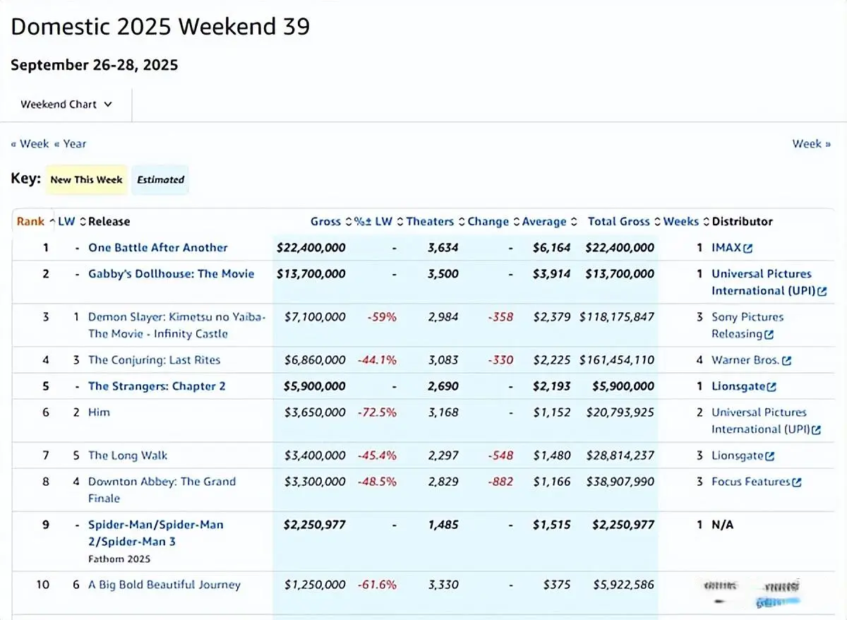 北美最新周末(9.26-9.28)票房出炉!“小李子”莱昂纳多·迪卡普里奥主演、PTA保罗·托马斯·安德森导演新片《一战再战》(One Battle After Another)北美首周末三天票房粗报2240万美元(开3634馆),空降北美周末票房榜冠军!创造PTA职业生涯最高开画,也已成为PTA职业生涯总票房第二高的单片,目前仅次于《血色将至》的4020万北美总票房。